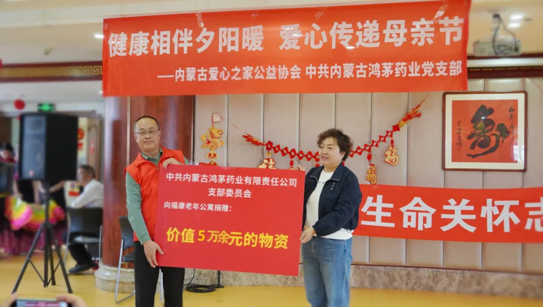 5月9日母亲节前夕,中共内蒙古鸿茅药业有限责任公司党支部委员会联合内蒙古爱心之家公益协会,走进内蒙古福康老年公寓,以“健康相伴夕阳暖 爱心传递母亲节”为主题,为百余位高龄老人送上价值5万余元的健康物资以及鲜花、定制蛋糕。
