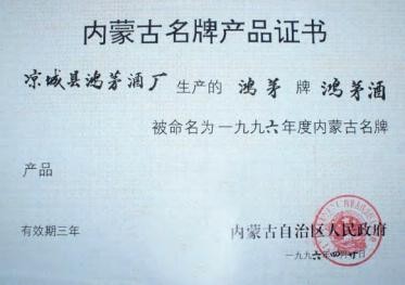 鸿茅药酒获内蒙古名牌产品证书