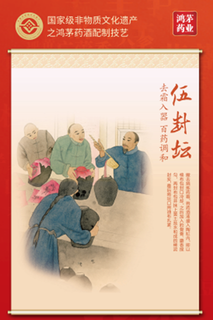 第五步,封坛。“去霜入器,百药调和。”撇去烧炼的药霜,将鸿茅药酒液盛入陶缸内,即以棉布包封口冷却,之后加入豹骨膏、麝香搅匀,再封布包并抹上黄土盐水合成的稀泥封实,最后将坛口用油布扎紧。