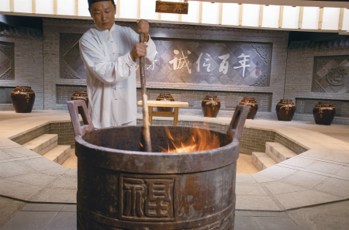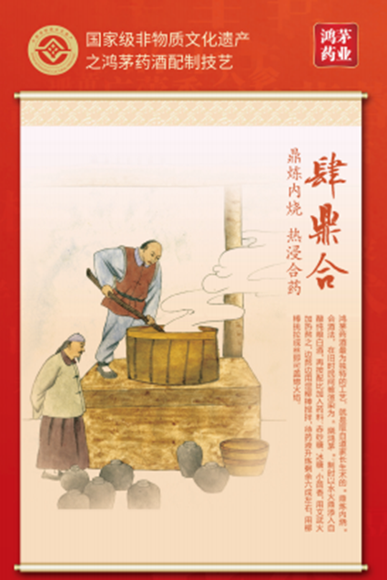 第四步,鼎合。“鼎炼内烧,热浸合药。”鸿茅药酒最为独特的工艺,就是取自道家长生术的“鼎炼内烧”合酒法,在旧时民间它被渲染为烧鸿茅。制时以自酿纯粮白酒,药料、赤砂糖、冰糖、小茴香等按配比加入水火鼎中,燃火加热熬之,边熬边用湿柳棒搅拌,待药液升炼剩余六成左右,用柳棒能挑拉成丝即可盖熄火焰。