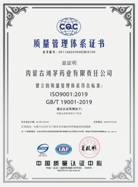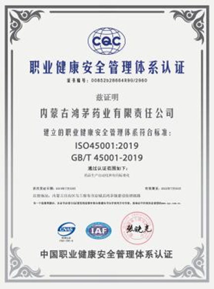 鸿茅药业的质量管理体系在 GMP 基础之上,取得 ISO9001 质量管理体系认证证书、ISO14001 环境管理体系认证证书及 ISO45001 职业健康安全管理体系认证书。标准和计量是质量的基础,三项ISO 管理体系认证的通过,标志着鸿茅药业在生产、销售、售后服务、环境、职业健康安全等方面建立起了一套符合国际标准的管理体系,也表明鸿茅药业在原有药品生产规范管理的基础上,进一步升级了企业的管理体系。由此,鸿茅药业具有了在国际市场上的竞争实力。