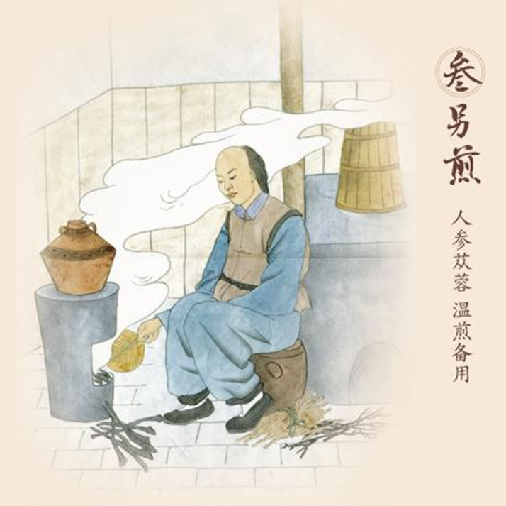 第三步,另煎——人参苁蓉 温煎备用。将人参、肉苁蓉两味贵细药材,加三倍量水,文火煎煮两个时辰,将煎液以棉纱滤过,再将浓缩滤液放冷备用。