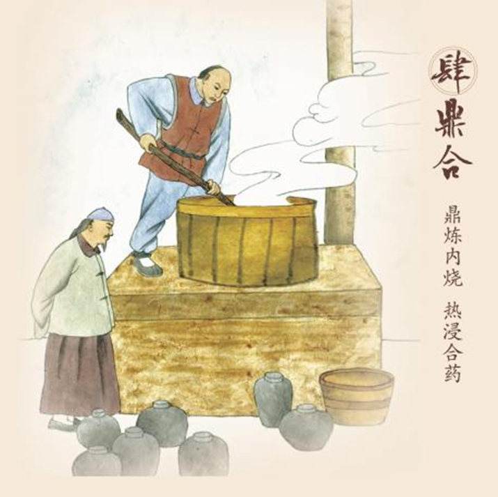第四步,鼎合——鼎炼内烧 热浸合药。鸿茅药酒最为独特的工艺,就是取自道家长生术的鼎炼内烧合酒法,在旧时民间该法被称为烧鸿茅。制时以自酿纯粮白酒,药面、赤糖、冰糖、小茴香等按配比加入水火鼎中,燃火加热熬之,边熬边用湿柳棒搅拌,待药液升炼剩余六成左右,用柳棒能挑拉成丝即可。