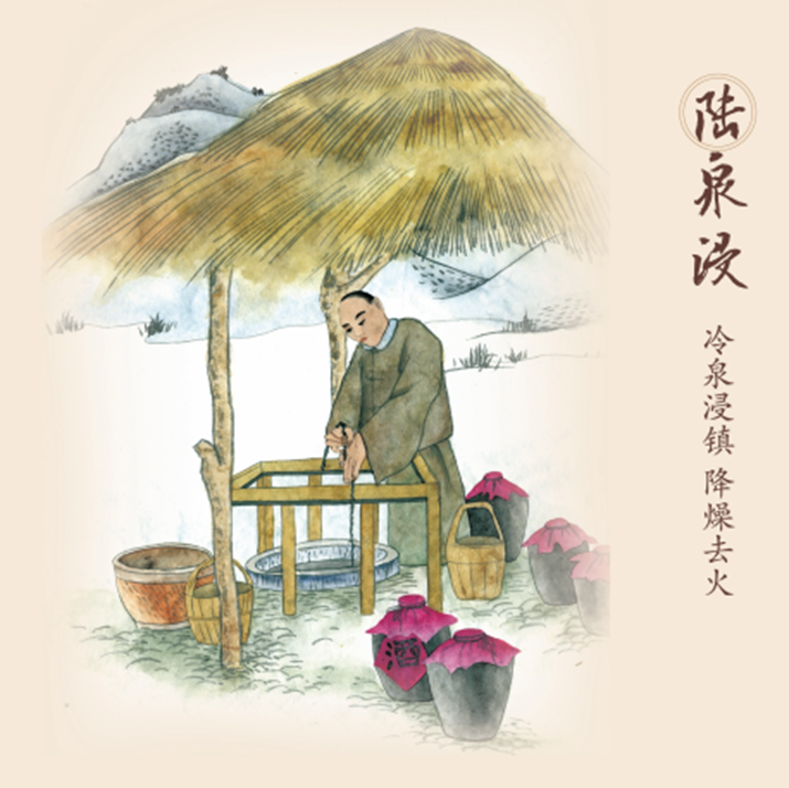 第六步,泉浸——冷泉浸镇 降燥去火。鸿茅药酒封坛后,先入冷泉井, 隔水浸镇三日三夜。泉浸是烧鸿茅后对药酒原液去其火气的重要过程。泉浸、地养的工艺过程,能使药性不燥,醇厚有神,最终达到阴阳调和、众药归一的上乘品质。