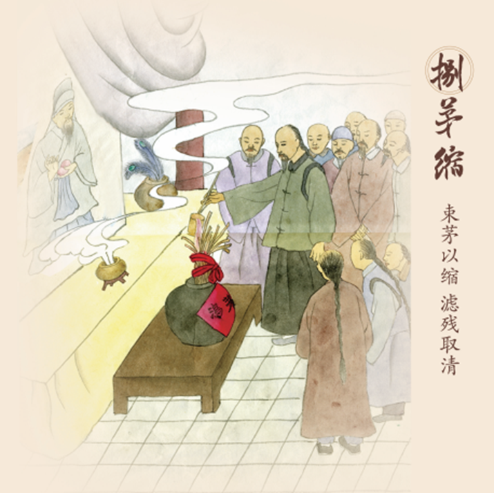 第八步,茅缩——束茅以缩 滤残取清。此为鸿茅药酒最后一道神秘而独特的工艺,它来自晋楚遗风,源于三千年前周室天子祭祀神农远祖的仪式,鸿茅名中茅之真义,便是发隐于此。经过秉烛焚香祷告之后,再以茅束缩酒,滤除残渣取清液,终成一剂济世宁人、饮之奇效的灵酒妙药。