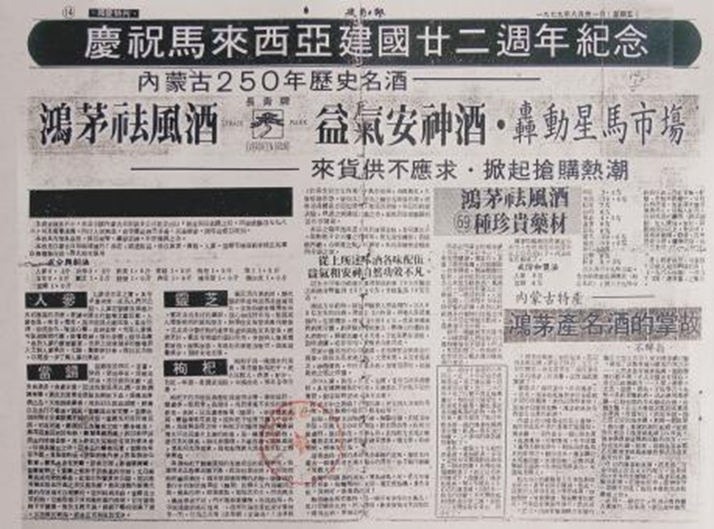 二十世纪七八十年代,鸿茅祛风酒作为内蒙古中药中成药类的代表,亮相广交会,销往马来西亚、新加坡、日本、朝鲜、蒙古等 20 多个国家和地区。1979 年 8 月 31 日,马来西亚最大的华文报纸《建国日报》的国庆特刊,用了一个专版宣传鸿茅祛风酒。
