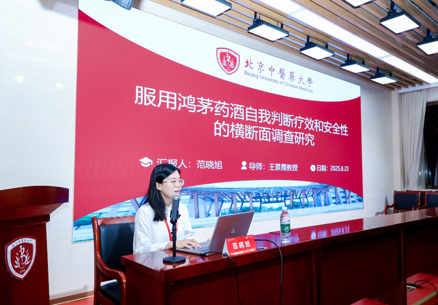 青年学者范晓旭博士作《服用鸿茅药酒自我判断疗效和安全性的横断面调查研究》主题报告